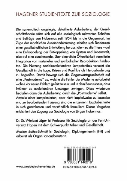 Die systematisch angelegte, detaillierte Aufarbeitung der Gesellschaftstheorie stützt sich auf alle soziologisch relevanten Schriften und Beiträge von Habermas seit 1954 bis in die Gegenwart. Im Zuge der inhaltlichen Auseinandersetzung schälen sich Tendenzen einer gesellschaftlichen Entwicklung heraus, die - so die These - auf eine Entkoppelung der Entkoppelung von System und Lebenswelt, also auf eine zunehmende, über eine vitale Öffentlichkeit vermittelte Integration von materieller und symbolischer Reproduktion hindeuten. Die Nutzung sozialrevolutionären Lernpotentials versetzt die Gesellschaft in die Lage, Krisen und Konflikte als Herausforderung zu begreifen. Damit bewegt sich die Gegenwartsgesellschaft auf eine "Postmoderne" zu, welche die Fehler der Moderne aufarbeitet - ohne vor neuen Fehlern gefeit zu sein und in dem Bewusstsein, dass Irrtümer zu evolutionären Umwegen zwingen. Diese wiederum bedürfen dann der Aufarbeitung durch die "Postmoderne" selbst.