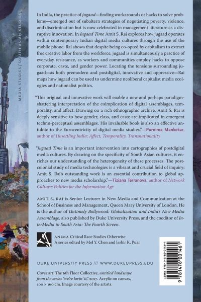 In India, the practice of jugaad-finding workarounds or hacks to solve problems-emerged out of subaltern strategies of negotiating poverty, discrimination, and violence but is now celebrated in management literature as a disruptive innovation. In Jugaad Time Amit S. Rai explores how jugaad operates within contemporary Indian digital media cultures through the use of the mobile phone. Rai shows that despite being co-opted by capitalism to extract free creative labor from the workforce, jugaad is simultaneously a practice of everyday resistance, as workers and communities employ hacks to oppose corporate, caste, and gender power. Locating the tensions surrounding jugaad-as both premodern and postdigital, innovative and oppressive-Rai maps how jugaad can be used to undermine neoliberal capitalist media ecologies and nationalist politics.