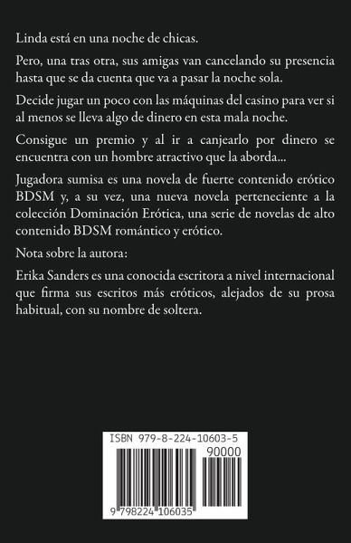 Linda está en una noche de chicas. Pero, una tras otra, sus amigas van cancelando su presencia hasta que se da cuenta que va a pasar la noche sola. Decide jugar un poco con las máquinas del casino para ver si al menos se lleva algo de dinero en esta mala noche. Consigue un premio y al ir a canjearlo por dinero se encuentra con un hombre atractivo que la aborda... Jugadora sumisa es una novela de fuerte contenido erótico BDSM y, a su vez, una nueva novela perteneciente a la colección Dominación Erótica, una serie de novelas de alto contenido BDSM romántico y erótico. Nota sobre la autora: Erika Sanders es una conocida escritora a nivel internacional que firma sus escritos más eróticos, alejados de su prosa habitual, con su nombre de soltera.