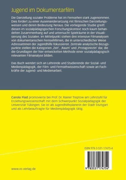 Die Darstellung sozialer Probleme hat im Fernsehen stark zugenommen. Dies fordert zu einer Auseinandersetzung mit filmischen Darstellungsweisen und deren Bedeutung heraus. Die vorliegende Studie greift diesen im sozialpädagogischen Forschungskontext noch kaum behandelten Zusammenhang auf und untersucht Spielräume in der Visualisierung des Sozialen. Im Mittelpunkt stehen drei intensive Filmanalysen von dokumentarischen Fernsehfilmen, die in unterschiedlicher Weise AdressatInnen der Jugendhilfe fokussieren. Zentrale analytische Bezugspunkte stellen die Kategorien 'Zeit', 'Raum' und 'ProtagonistIn' dar, die die Grundlagen der hier entwickelten Methode einer sozialpädagogisch relevanten Filmanalyse bilden. Das Buch wendet sich an Lehrende und Studierende der Sozial- und Medienpädagogik, der Film- und Fernsehwissenschaft sowie an Fachkräfte der Jugend- und Medienarbeit.