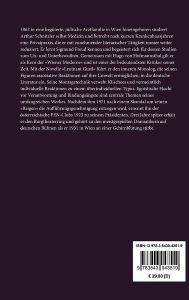 1862 in eine begüterte, jüdische Arztfamilie in Wien hineingeboren studiert Arthur Schnitzler selbst Medizin und betreibt nach kurzen Krankenhausjahren eine Privatpraxis, die er mit zunehmender literarischer Tätigkeit immer weiter reduziert. Er lernt Sigmund Freud kennen und begeistert sich für dessen Studien zum Un- und Unterbewußten. Gemeinsam mit Hugo von Hofmannsthal gilt er als Kern der "Wiener Moderne" und ist einer der bedeutendsten Kritiker seiner Zeit. Mit der Novelle "Leutnant Gustl" führt er den inneren Monolog, die seinen Figuren assoziative Reaktionen auf ihre Umwelt ermöglichen, in die deutsche Literatur ein. Seine Montagetechnik verwebt Klischees und vermeintlich individuelle Reaktionen zu einem überindividuellen Typus. Egoistische Flucht vor Verantwortung und Bindungsängste sind zentrale Themen seines umfangreichen Werkes. Nachdem ihm 1921 nach einem Skandal um seinen "Reigen" die Aufführungsgenehmigung entzogen wird, ernennt ihn der österreichische PEN-Clubs 1923 zu seinem Präsidenten. Drei Jahre später erhält er den Burgtheaterring und gehört zu den meistgespielten Dramatikern auf deutschenBühnen als er 1931 in Wien an einer Gehirnblutung stirbt.