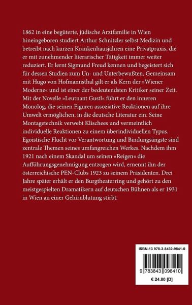 1862 in eine begüterte, jüdische Arztfamilie in Wien hineingeboren studiert Arthur Schnitzler selbst Medizin und betreibt nach kurzen Krankenhausjahren eine Privatpraxis, die er mit zunehmender literarischer Tätigkeit immer weiter reduziert. Er lernt Sigmund Freud kennen und begeistert sich für dessen Studien zum Un- und Unterbewußten. Gemeinsam mit Hugo von Hofmannsthal gilt er als Kern der "Wiener Moderne" und ist einer der bedeutendsten Kritiker seiner Zeit. Mit der Novelle "Leutnant Gustl" führt er den inneren Monolog, die seinen Figuren assoziative Reaktionen auf ihre Umwelt ermöglichen, in die deutsche Literatur ein. Seine Montagetechnik verwebt Klischees und vermeintlich individuelle Reaktionen zu einem überindividuellen Typus. Egoistische Flucht vor Verantwortung und Bindungsängste sind zentrale Themen seines umfangreichen Werkes. Nachdem ihm 1921 nach einem Skandal um seinen "Reigen" die Aufführungsgenehmigung entzogen wird, ernennt ihn der österreichische PEN-Clubs 1923 zu seinem Präsidenten. Drei Jahre später erhält er den Burgtheaterring und gehört zu den meistgespielten Dramatikern auf deutschenBühnen als er 1931 in Wien an einer Gehirnblutung stirbt.