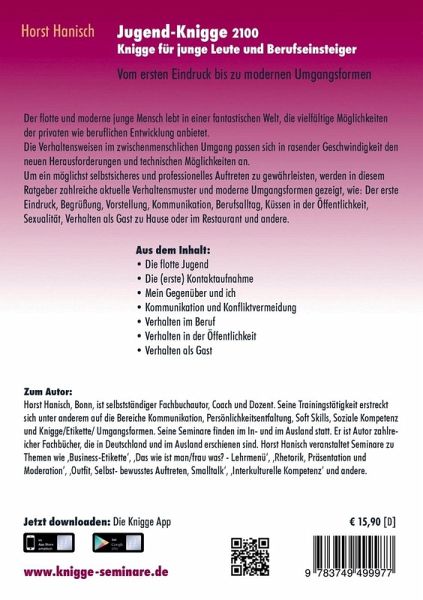 Knigge für junge Leute und Berufseinsteiger.Die Jugend ist etwas WundervollesDer flotte und moderne junge Mensch lebt in einer fantastischen Welt, die vielfältige Möglichkeiten der privaten wie beruflichen Entwicklung anbietet.Die Verhaltensweisen im zwischenmenschlichen Umgang passen sich in rasender Geschwindigkeit den neuen Herausforderungen und technischen Möglichkeiten an.Um ein möglichst selbstsicheres und professionelles Auftreten zu gewährleisten, werden in diesem Ratgeber zahlreiche aktuelle Verhaltensmuster und moderne Umgangsformen gezeigt, wie: Der erste Eindruck, Begrüßung, Vorstellung, Kommunikation, Berufsalltag, Küssen in der Öffentlichkeit, Sexualität, Verhalten als Gast zu Hause oder im Restaurant und andere. Aus den Inhalt:- Die flotte Jugend- Die (erste) Kontaktaufnahme- Mein Gegenüber und ich- Kommunikation und Konfliktvermeidung- Verhalten im Beruf- Verhalten in der Öffentlichkeit- Verhalten als Gast
