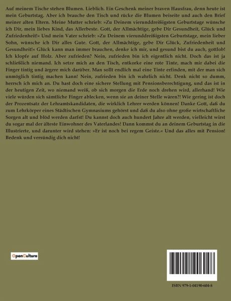 Auf meinem Tische stehen Blumen. Lieblich. Ein Geschenk meiner braven Hausfrau, denn heute ist mein Geburtstag. Aber ich brauche den Tisch und rücke die Blumen beiseite und auch den Brief meiner alten Eltern. Meine Mutter schrieb: »Zu Deinem vierunddreißigsten Geburtstage wünsche ich Dir, mein liebes Kind, das Allerbeste. Gott, der Allmächtige, gebe Dir Gesundheit, Glück und Zufriedenheit!« Und mein Vater schrieb: »Zu Deinem vierunddreißigsten Geburtstage, mein lieber Sohn, wünsche ich Dir alles Gute. Gott, der Allmächtige, gebe Dir Glück, Zufriedenheit und Gesundheit!« Glück kann man immer brauchen, denke ich mir, und gesund bist du auch, gottlob! Ich klopfe auf Holz. Aber zufrieden? Nein, zufrieden bin ich eigentlich nicht. Doch das ist ja schließlich niemand. Ich setze mich an den Tisch, entkorke eine rote Tinte, mach mir dabei die Finger tintig und ärgere mich darüber. Man sollt endlich mal eine Tinte erfinden, mit der man sich unmöglich tintig machen kann! Nein, zufrieden bin ich wahrlich nicht. Denk nicht so dumm, herrsch ich mich an. Du hast doch eine sichere Stellung mit Pensionsberechtigung, und das ist in der heutigen Zeit, wo niemand weiß, ob sich morgen die Erde noch drehen wird, allerhand! Wie viele würden sich sämtliche Finger ablecken, wenn sie an deiner Stelle wären?! Wie gering ist doch der Prozentsatz der Lehramtskandidaten, die wirklich Lehrer werden können! Danke Gott, daß du zum Lehrkörper eines Städtischen Gymnasiums gehörst und daß du also ohne große wirtschaftliche Sorgen alt und blöd werden darfst! Du kannst doch auch hundert Jahre alt werden, vielleicht wirst du sogar mal der älteste Einwohner des Vaterlandes! Dann kommst du an deinem Geburtstag in die Illustrierte, und darunter wird stehen: »Er ist noch bei regem Geiste.« Und das alles mit Pension! Bedenk und versündig dich nicht!