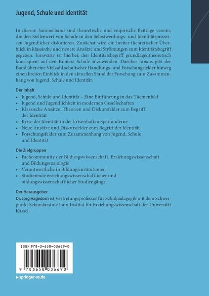 In diesem Sammelband sind theoretische und empirische Beiträge vereint, die den Stellenwert von Schule in den Selbstwerdungs- und Identitätsprozessen Jugendlicher diskutieren. Zunächst wird ein breiter theoretischer Überblick in klassische und neuere Ansätze und Strömungen zum Identitätsbegriff gegeben. Innovativ ist hierbei, den Identitätsbegriff grundlagentheoretisch konsequent auf den Kontext Schule anzuwenden. Darüber hinaus gibt der Band über eine Vielzahl schulischer Handlungs- und Forschungsfelder hinweg einen breiten Einblick in den aktuellen Stand der Forschung zum Zusammenhang von Jugend, Schule und Identität.
