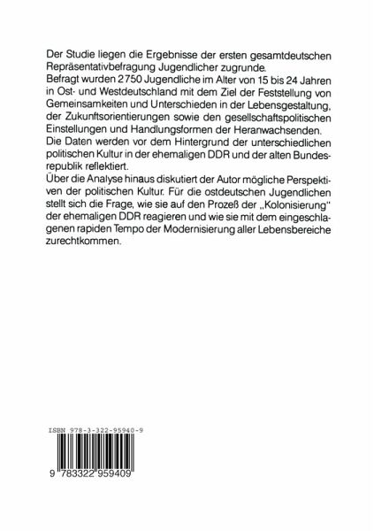 Die Studie basiert auf reprasentativ erhobenen Befunden des ersten gesamt deutschen Jugendsurveys nach der politischen Wende in der ehemaligen DDR im Herbst 1989. Dokumentiert werden Gemeinsamkeiten und Unterschiede in den politischen Einstellungen, den Wert-und Zukunfisorientierungen und im Politikverhalten der Jugendlichen in Ost-und Westdeutschland im ProzeB der Vereinigung. Die Untersuchung wurde mit 2750 Jugendlichen im Alter von 15 bis 24 Jah ren, davon 1500 aus den alten und 1250 aus den neuen Bundeslandern, Ende 1990/ Anfang 1991 durchgefuhrt und bezieht sich auf alle Bereiche, die fur die "politische Kultur" von Bedeutung sind. Es wird von einem lebensweltorien tierten KOilzept politischer Sozialisation der Jugendlichen ausgegangen, das in klassische Fragen wie "Einstellungen zum politischen System", "politische Partizipations-und Handlungsformen" oder "gesellschafispolitische Einstel lungen und Orientierungen" miindet, diese aber vor dem Hintergrund biogra phi scher Erfahrungen in Familie, Schule, Peers, Beruf etc. zu erklaren ver sucht. Die Untersuchungsergebnisse werden auf der einen Seite vor der Folie der Unterschiede politischer Kultur in der ehemaligen DDR und der alten BRD, die eher Einstellungsunterschiede als Ubereinstimmungen erwarten lassen, erklart. Auf der anderen Seite wird von globalen Entwicklungslinien der Ju gend ausgegangen, die im Rahmen eines sozia16kologischen Forschungskon zeptes zu ermitteln versucht werden: Die systemischen Relationen der fur den jugendlichen Lebenslauf relevanten Bereiche werden in Abhangigkeit yom Modernisierungsgrad der jeweiligen Gesellschafi begriffen. In dieser Per spektive laBt sich eine Angleichung in den Strukturen der Jugendphase in Ost und West als Ausdruck einer kulturiibergreifenden, universellen Entwicklung von Jugend interpretieren.