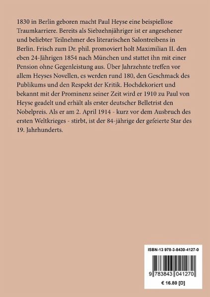 Paul Heyse: Jugenderinnerungen und Bekenntnisse Erstdruck in vier Bänden: Hannover (Rümpler) 1868. Vollständige Neuausgabe mit einer Biographie des Autors. Herausgegeben von Karl-Maria Guth. Berlin 2014. Textgrundlage ist die Ausgabe: Heyse, Paul: Jugenderinnerungen und Bekenntnisse. 5. Auflage, neu durchgesehen und stark vermehrt, 1. Band: Aus dem Leben, Stuttgart und Berlin: Cotta, 1912. Die Paginierung obiger Ausgabe wird in dieser Neuausgabe als Marginalie zeilengenau mitgeführt. Umschlaggestaltung von Thomas Schultz-Overhage unter Verwendung des Bildes: Adolf Friedrich Erdmann von Menzel: Porträt des Paul Heyse, 1853. Gesetzt aus Minion Pro, 11 pt. Über den Autor: 1830 in Berlin geboren macht Paul Heyse eine beispiellose Traumkarriere. Bereits als Siebzehnjähriger ist er angesehener und beliebter Teilnehmer des literarischen Salontreibens in Berlin. Frisch zum Dr. phil. promoviert holt Maximilian II. den eben 24-Jährigen 1854 nach München und stattet ihn mit einer Pension ohne Gegenleistung aus. Über Jahrzehnte treffen vor allem Heyses Novellen, es werden rund 180, den Geschmack des Publikums und den Respekt der Kritik. Hochdekoriert und bekannt mit der Prominenz seiner Zeit wird er 1910 zu Paul von Heyse geadelt und erhält als erster deutscher Belletrist den Nobelpreis. Als er am 2. April 1914 - kurz vor dem Ausbruch des ersten Weltkrieges - stirbt, ist der 84-jährige der gefeierte Star des 19. Jahrhunderts.