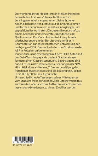 Der vierzehnjährige Holger lernt in Meißen Porzellan herzustellen. Fort von Zuhause fühlt er sich im Lehrlingswohnheim angenommen. Seine Erzieher haben einen positiven Einfluss auf sein Vorankommen und formen behutsam sein sensibles, neugieriges und oppositionelles Auftreten. Die Jugendfreundschaft zu einem Koreaner und seine erste Jugendliebe sind Quellen seiner Persönlichkeitsentwicklung. Immer wieder, besonders in der Berufsschule gerät er in Konfrontation zur gesellschaftlichen Entwicklung der noch jungen DDR. Dennoch wird er zum Studium an der ABF in Potsdam aufgenommen.Innere…mehr