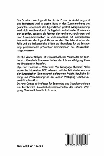 Die hier vorgelegte Untersuchung iiber LebensHiufe marginalisierter Jugendli cher wurde im Rahmen eines Forschungs-und Weiterbildungsprojektes an der Johann-Wolfgang Goetbe-Universitlit in FrankfurtlMain von den Autoren durch gefiihrt. Renate Dichmann und Martin Ehlert haben an den g~meinsamen Inter pretationssitzungen des Projektes teilgenommen. Ihnen verdanken wir wertvolle Anregungen. Finanziell unterstiitzt wurde das Projekt vom EG-Sozialfonds und der Stiftung "Hilfe zur Selbsthilfe" der Deutschen Bank. Dank schulden wir in erster Linie den von uns befragten Jugendlichen, die bereit waren, uns, zum Teil sehr pers6nliche, biographische Erlebnisse und Erfahrungen zu erzlihlen. Wert volle Hinweise fUr unsere Forschungsarbeit verdanken wir auch Ulrich Oever mann. In den Fallanalyseseminaren der von uns durchgefiihrten Weiterbildung konnten wir auch von den beruflichen Erfahrungen der Kursteilnehmer, die mit arbeitslosen und marginalisierten Jugendlichen arbeiteten, profitieren. Einleitung A'IIo Combe 1m Gegensatz zu manchen euphorischen Aonahmen im Rahmen des sogenann ten Individualisierungs-Theorems treten bei der hermeneutischen Fallrekon struktion scheitemder Bildungs- und AusbildungsverHiufe Jugendlicher zu nlichst die Zwlinge hervor, die modemen gesellschaftlichen Rationalisierungs formen - bis in die inneren Entfaltungsgesetzlichkeiten jugendlicher Praxen hinein - innewohnen. Die Frage nach resistenten Verarbeitungsformen bedarf einer differenzierten und - wie wir meinen - fallspezifischen Rekonstruktion und Diskussion. Wir werden auf diese Thesen noch zuriickkommen. Diese Untersuchung ist Teil des von der EG finanzierten Forschungs-und Weiterbildungsprojekts "Berufliche Bildung und Berufsberatung" , das wir yom 01. 12. 1987 bis zum 30. 11. 1990 durchftihrten.