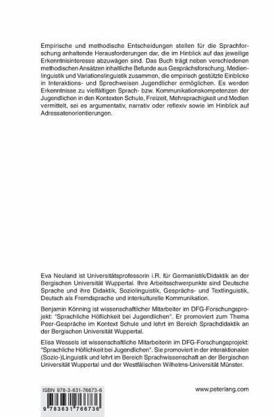 Eva Neuland ist Universitätsprofessorin i.R. für Germanistik/Didaktik an der Bergischen Universität Wuppertal. Ihre Arbeitsschwerpunkte sind Deutsche Sprache und ihre Didaktik, Soziolinguistik, Gesprächs- und Textlinguistik, Deutsch als Fremdsprache und interkulturelle Kommunikation. Benjamin Könning ist wissenschaftlicher Mitarbeiter im DFG-Forschungsprojekt: "Sprachliche Höflichkeit bei Jugendlichen". Er promoviert zum Thema Peer-Gespräche im Kontext Schule und lehrt im Bereich Sprachdidaktik an der Bergischen Universität Wuppertal. Elisa Wessels ist wissenschaftliche Mitarbeiterin im DFG-Forschungsprojekt: "Sprachliche Höflichkeit bei Jugendlichen". Sie promoviert in der interaktionalen (Sozio-)Linguistik und lehrt im Bereich Sprachwissenschaft an der Bergischen Universität Wuppertal und der Westfälischen Wilhelms-Universität Münster.