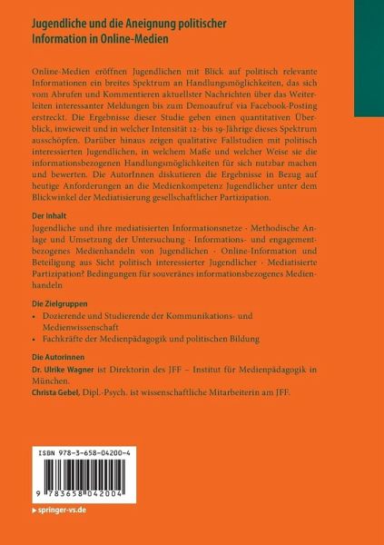 Online-Medien eröffnen Jugendlichen in Hinblick auf politisch relevante Information ein breites Spektrum an Handlungsmöglichkeiten, das sich vom Abrufen und Kommentieren aktuellster Nachrichten über das Weiterleiten interessanter Meldungen bis zum Demoaufruf via Facebook-Posting erstreckt. Die Ergebnisse der vorliegenden Studie geben einen quantitativen Überblick, inwieweit und in welcher Intensität 12- bis 19-Jährige dieses Spektrum ausschöpfen. Darüber hinaus zeigen qualitative Fallstudien mit politisch interessierten Jugendlichen, in welchem Maße und welcher Weise sie die informationsbezogenen Handlungsmöglichkeiten für sich nutzbar machen und bewerten. Die Autorinnen diskutieren die Ergebnisse in Hinblick auf heutige Anforderungen an die Medienkompetenz Jugendlicher unter dem Blickwinkel der Mediatisierung gesellschaftlicher Partizipation.