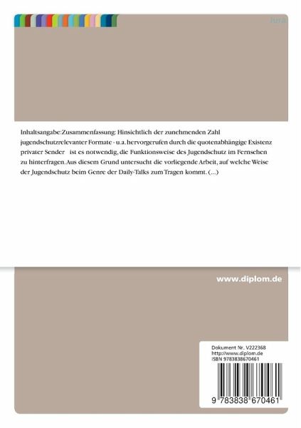 Grundlegende Fragen nach dem Selbstverständnis, der Intention und den Aufgaben des Jugendschutzes sind zu klären, genauso wie der rechtliche Rahmen (GG, StGB, RStV), Jugendschutz-Richtlinien, -einrichtungen und -verfahren. Der Kern der Studie befasst sich mit der konkreten Jugendschutz-Durchführung bei ausgewählten Talk Shows. Die Abgrenzung zwischen Verstößen/nicht gefährdenden Talk Shows wird aufgezeigt, Stärken und Schwächen bezüglich der Gesetze, Richtlinien, Verfahren usw. demonstriert, um einen effektiven und verbesserten Jugendschutz für die Zukunft anzuregen.