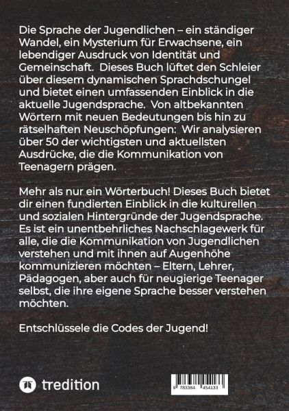 Die Sprache der Jugendlichen - ein ständiger Wandel, ein Mysterium für Erwachsene, ein lebendiger Ausdruck von Identität und Gemeinschaft. Dieses Buch lüftet den Schleier über diesem dynamischen Sprachdschungel und bietet einen umfassenden Einblick in die aktuelle Jugendsprache. Von altbekannten Wörtern mit neuen Bedeutungen bis hin zu rätselhaften Neuschöpfungen: Wir analysieren die wichtigsten und aktuellsten Ausdrücke, die die Kommunikation von Teenagern prägen.Mehr als nur ein Wörterbuch! Dieses Buch bietet dir einen fundierten Einblick in die kulturellen und sozialen Hintergründe der Jugendsprache. Es ist ein unentbehrliches Nachschlagewerk für alle, die die Kommunikation von Jugendlichen verstehen und mit ihnen auf Augenhöhe kommunizieren möchten - Eltern, Lehrer, Pädagogen, aber auch für neugierige Teenager selbst, die ihre eigene Sprache besser verstehen möchten.Entschlüssele die Codes der Jugend!
