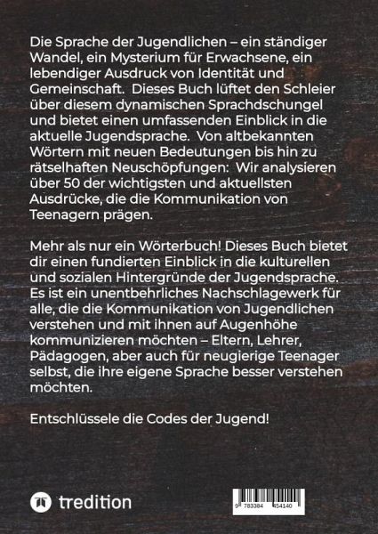 Die Sprache der Jugendlichen - ein ständiger Wandel, ein Mysterium für Erwachsene, ein lebendiger Ausdruck von Identität und Gemeinschaft. Dieses Buch lüftet den Schleier über diesem dynamischen Sprachdschungel und bietet einen umfassenden Einblick in die aktuelle Jugendsprache. Von altbekannten Wörtern mit neuen Bedeutungen bis hin zu rätselhaften Neuschöpfungen: Wir analysieren die wichtigsten und aktuellsten Ausdrücke, die die Kommunikation von Teenagern prägen.Mehr als nur ein Wörterbuch! Dieses Buch bietet dir einen fundierten Einblick in die kulturellen und sozialen Hintergründe der Jugendsprache. Es ist ein unentbehrliches Nachschlagewerk für alle, die die Kommunikation von Jugendlichen verstehen und mit ihnen auf Augenhöhe kommunizieren möchten - Eltern, Lehrer, Pädagogen, aber auch für neugierige Teenager selbst, die ihre eigene Sprache besser verstehen möchten.Entschlüssele die Codes der Jugend!