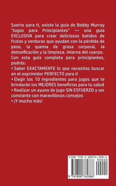 Aprende Sobre la Forma MÁS Eficaz de Incorporar sin Esfuerzo más Frutas y Verduras a tu Dieta con esta Guía para Principiantes. ¿Sabías que agregar más frutas y verduras a tu dieta ayuda a mejorar tu salud mental y tu bienestar general? Sin ellas, es más probable que sufras de hemorroides, diverticulosis y estreñimiento. Desafortunadamente, aunque todos sabemos esto, solo muy pocas personas pueden consumir religiosamente frutas y verduras a diario. La mayoría de las veces, las personas no agregan más verduras y frutas a sus dietas porque no tienen tiempo o no saben cómo incorporarlas en sus recetas. Y, si somos honestos, a algunos de nosotros no nos gusta el sabor de las verduras, o probablemente estamos demasiado llenos después de una comida para comer una fruta. Suerte para ti, existe la guía de Bobby Murray "Jugos para Principiantes" - una guía EXCLUSIVA para crear deliciosos batidos de frutas y verduras que ayudan con la pérdida de peso, la quema de grasa corporal, la detoxificación y la limpieza. interna del cuerpo. Con esta guía completa para principiantes, podrás:Saber EXACTAMENTE lo que necesitas buscar en el exprimidor PERFECTO para ti Elegir los 10 ingredientes para jugos que te brindarán los MEJORES beneficios para tu salud Realizar un ayuno de jugo SIN ESFUERZO y ser constante con maravillosos consejos ¡Y mucho más! La mayoría de las guías para hacer jugos hacen que sea difícil ser constante con el ayuno Cuando tengas esta guía, obtendrás una guía fácil con consejos que te ayudarán a seguir el ayuno de jugos con FACILIDAD y llegar a tu salud y peso ideal. ¡Dirígite Arriba, Haz Clic en "Comprar Ahora" y Comienza tu Camino Hacia una Mejor Salud Bebiendo Jugos!