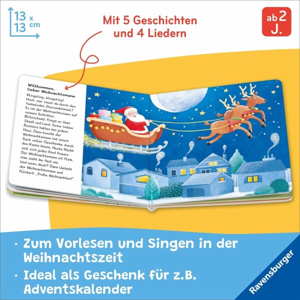 Alle freuen sich auf Weihnachten. Ein idealer Begleiter für die Vorweihnachtszeit ist dabei dieses Kinderbuch, das zum gemeinsamen Vorlesen und Singen einlädt. So begleiten die Kleinen den Weihnachtsmann in seinem Schlitten ebenso wie Kinder, die um den Weihnachtsbaum tanzen, fröhlich musizieren oder schon die Geschenke auspacken. Die Texte und Noten zu den folgenden weihnachtlichen Liedern sind im Buch enthalten: "Ihr Kinderlein kommet", "O du fröhliche", "Alle Jahre wieder" und "Lasst uns froh und munter sein".