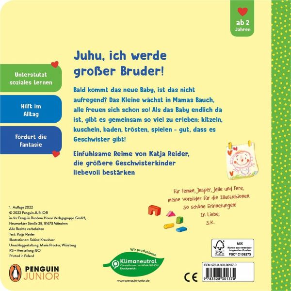 Bald kommt das neue Geschwisterchen, ist das nicht aufregend? Das Kleine wächst in Mamas Bauch, alle freuen sich schon so! Als das Baby endlich da ist, gibt es für die ganze Familie so viel zu erleben: kitzeln, kuscheln, baden, trösten, spielen. Und auch, wenn Mama und Papa jetzt manchmal weniger Zeit haben, macht das Zusammensein doch so viel Spaß: Gut, dass es Geschwister gibt!