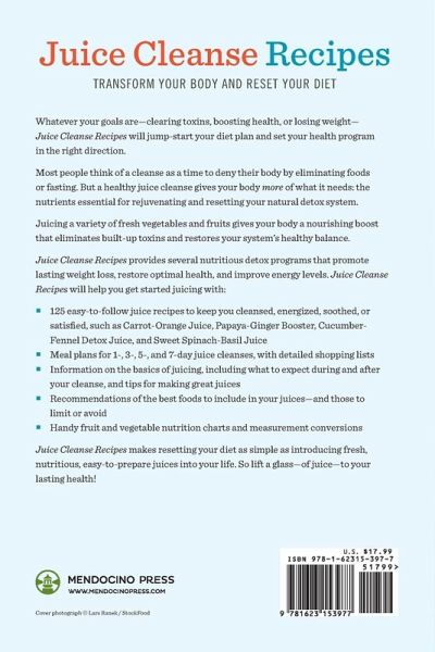 Whatever your goals are-clearing toxins, boosting health, or losing weight- Juice Cleanse Recipes will jump-start your diet plan and set your health program in the right direction. Most people think of a cleanse as a time to deny their body by eliminating foods or fasting. But a healthy juice cleanse gives your body more of what it needs: the nutrients essential for rejuvenating and resetting your natural detox system. Juicing a variety of fresh vegetables and fruits gives your body a nourishing boost that eliminates built-up toxins and restores your system's healthy balance. Juice Cleanse Recipes provides several nutritious detox programs that promote lasting weight loss, restore optimal health, and improve energy levels. Juice Cleanse Recipes will help you get started juicing with: 125 easy-to-follow juice recipes to keep you cleansed, energized, soothed, or satisfied, such as Carrot-Orange Juice, Papaya-Ginger Booster, Cucumber-Fennel Detox Juice, and Sweet Spinach-Basil Juice Meal plans for 1-, 3-, 5-, and 7-day juice cleanses, with detailed shopping lists Information on the basics of juicing, including what to expect during and after your cleanse, tips for making great juices Recommendations of the best foods to include in your juices-and those to limit or avoid Handy fruit and vegetable nutrition charts and measurement conversions Juice Cleanse Recipes makes resetting your diet as simple as introducing fresh, nutritious, easy-to-prepare juices into your life. So lift a glass-of juice-to your lasting health!"