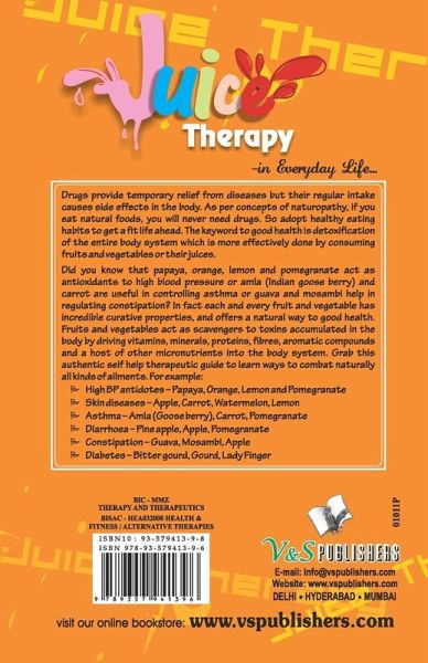 Drugs provide temporary relief from diseases but their regular intake causes side effects in the body. As per concepts of naturopathy, if you eat natural foods, you will never need drugs. So adopt healthy eating habits to get a fit life ahead. The keyword to good health is detoxification of the entire body system which is more effectively done by consuming fruits and vegetables or their juices. Did you know that papaya, orange, lemon and pomegranate act as antioxidants to high blood pressure or amla (Indian goose berry) and carrot are useful in controlling asthma or guava and mosambi help in regulating constipation? In fact each and every fruit and vegetable has incredible curative properties, and offers a natural way to good health. Fruits and vegetables act as scavengers to toxins accumulated in the body by driving vitamins, minerals, proteins, fibres, aromatic compounds and a host of other micronutrients into the body system. Grab this authentic self help therapeutic guide to learn ways to combat naturally all kinds of ailments. For example: High BP antidotes - Papaya, Orange, Lemon and Pomegranate Skin diseases - Apple, Carrot, Watermelon, Lemon Asthma - Amla (Goose berry), Carrot, Pomegranate Diarrhoea - Pine apple, Apple, Pomegranate Constipation - Guava, Mosambi, Apple Diabetes - Bitter gourd, Gourd, Lady Finger