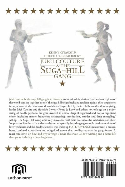 juici couture & the suga hill gang is a cinematic street tale of six victims from various regions of the world coming together as one "the suga hill to get back and retaliate against their oppressors in ways none of the hood/world would ever forget. Led by their cold hearted and unforgiving leader Juici Couture and sidekicks Sweets (Sweet & Low) and others not only go on a major string of deadly payback, but gets involved in a knee deep of organized and not so organized crime; including money laundering racketeering, prostitution, murder and drug smuggling/selling. The Suga Hill Gang were very successful with first five successful retaliations on their "oppressors' but the sixth and seventh (and supposedly last) the gang stumble on the emotions of love verses hate and the deadly elements that make up HATE/REVENGE; resentment, a broken heart, confused admirations and misguided secrets that possibly separate the gang forever. A must read novel on how and why revenge is never that sweet & how wishing one a better life than yours is the key to true happiness...