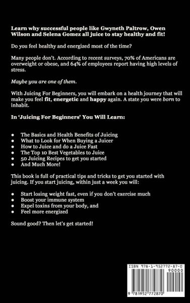 Improve Your Health With Juicing! Learn why successful people like Gwyneth Paltrow, Owen Wilson, and Selena Gomez all juice to stay healthy and fit! Get access to: - Easy, step-by-step juice instructions - 50 juicing recipes Get Your Copy of 'Juicing For Beginners' Do you feel healthy and energized most of the time? Many people don't. A whopping 70% of Americans are either overweight or obese! And 64% of employees report having high levels of stress. No wonder that an astonishing number of people are on prescription drugs. Joe Cross was one of them. Until, one day, he decided to take back control of his health. He did a juice fast, which you can follow in the documentary 'Fat, Sick & Nearly Dead'. He came out 82 pounds lighter and lost all of the symptoms of his autoimmune disease. This is the promise that juicing holds for you. Why You Should Check Out 'Juicing For Beginners' With 'Juicing For Beginners', you will embark on a health journey that will make you feel fit, energetic, and happy again. A state you were born to inhabit. Your body is like a Ferrari: you need to give it the right fuel to perform well. Ferraris can't race on beer... But if you fill it up with the right gasoline, oh boy, you better buckle your seatbelt! Juicing is an excellent way to lose weight, cleanse your body, detox and feel good about yourself.Here's What You Will Learn in 'Juicing For Beginners': - The Basics of Juicing - The Health Benefits of Juicing - The Difference Between Juicing and Blending - What to Look for When Buying a Juicer - How to Juice - The Top 10 Best Vegetables to Juice - How to do a Juice Fast - 50 Juicing Recipes to Get You Started - And Much More! This book is loaded with practical tips and tricks to begin your juicing journey. If you start juicing, within just a week you will: - Start losing weight fast, even if you don't exercise much - Boost your immune system - Expel toxins from your body, and Feel more energized Still hesitating? Then get this; as a FREE & EXCLUSIVE BONUS, you'll also get: - Bonus 1: 30 EXTRA juicing recipes (Yes, that's right: 80 juice recipes in total!) - Bonus 2: the chapter 'What Is Intermittent Fasting?' from my other book, 'Intermittent Fasting: Burn Fat, Lose Weight And Build Muscle With Ease While Still Eating Your Favorite Foods!' Sound good? Now is the day on which you can take the first step to changing your life through juicing. Let's get started, shall we? Take action now! Scroll to the top of this page and click the 'Buy Now' button.