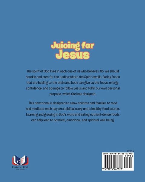 The spirit of God lives in each one of us who believes. So, we should nourish and care for the bodies where the Spirit dwells. Eating foods that are healing to the brain and body can give us the focus, energy, confidence, and courage to follow Jesus and fulfill our own personal purpose, which God has designed. This devotional is designed to allow children and families to read and meditate each day on a biblical story and a healthy food source. Learning and growing in God's word and eating nutrient-dense foods can help lead to physical, emotional, and spiritual well-being.