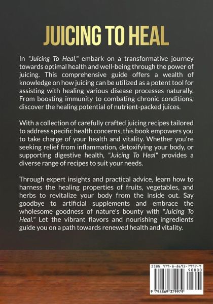 Title: Juicing to Heal: Transform Your Health and Heal Naturally Do you want to experience the profound impact of juicing? With "Juicing to Heal" this extensive manual reveals the hidden techniques of utilizing the therapeutic qualities of natural substances by means of the practice of juicing. This book provides a comprehensive method for enhancing your energy levels, enhancing digestion, and relieving chronic problems by incorporating the straightforward practice of juicing into your routine. Inside "Juicing to Heal," you'll find a wealth of knowledge on the benefits of juicing for your body, mind, and spirit. Discover the process of converting fresh fruits, andvegetables, into powerful medicines that provide nourishment and revitalization for yourbody. This book serves as a comprehensive guide to harnessing the therapeutic properties of nature's abundance, ranging from cleansing chlorophyll-rich green juices to antioxidant-packed berry blends that support optimal health. Embark on a quest for optimal health and energy by exploring the delectable and nourishing recipes showcased in "Juicing to Heal." Featuring more than 85delectable recipes tailored to address various health issues and enhance overall well-being, this collection will provide you with abundant inspiration during your juicing expedition. Bid farewell to tiredness, inflammation, and digestive troubles as you welcome the therapeutic potency of freshly made, nutritionally rich juices. Transform your health and heal naturally with "Juicing to Heal." Whether you are an experienced juicing enthusiast or a novice embarking on your journey to wellbeing, this book equips you with the necessary tools, knowledge, and motivation to flourish. Take control of your health today and experience the life-changing benefits of juicing. Get your book now!