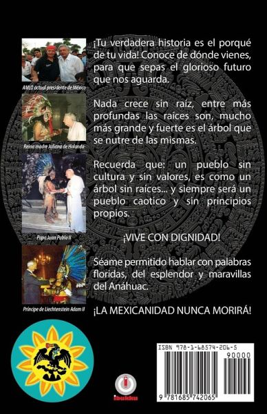 ¡Tu verdadera historia es el porqué de tu vida! Conoce de dónde vienes, para que sepas el glorioso futuro que nos aguarda. Nada crece sin raíz, entre más profundas las raíces son, mucho más grande y fuerte es el árbol que se nutre de las mismas. Recuerda que: un pueblo sin cultura y sin valores, es como un árbol sin raíces... y siempre será un pueblo caotico y sin principios propios. ¡VIVE CON DIGNIDAD! Séame permitido hablar con palabras oridas, del esplendor y maravillas del Anáhuac. ¡LA MEXICANIDAD NUNCA MORIRÁ!