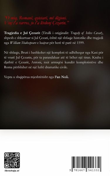 LIBRASHQIP me anë të gamës "Klasikët Botërorë", ju fton të nisni një udhëtim të jashtëzakonshëm letrar nëpër shekuj me një koleksion magjepsës që celebron thelbin e letërsisë së përjetshme. Zhytuni në një tapiceri të pasur të imagjinatës dhe përvojës njerëzore ndërsa eksploroni një antologji të kuruar për t'ju sjellur më të mirat e letërsisë botërore. "Tragjedia e Jul Çezarit" është një nga veprat më të njohura të William Shakespeare dhe tani disponohet në një përkthim të shkëlqyer në gjuhën shqipe nga Fan Noli. Kjo tragjedi e mahnitshme zhyt lexuesin në botën e njërës prej figurave më të rëndësishme të historisë së lashtë: Jul Çezarit Në rrëfimin e tij të pasionuar, Shakespeare shpalos një përplasje të fortë midis vetëdijes individuale dhe interesave të përgjithshme të kombit. Ai zbërthen ambiciet, konspiracionet dhe rrugëtimin e vështirë drejt tronditjes finale. Intriga, tradhëtia dhe varfëria e karaktereve krijojnë një shfaqje dramatike e cila nuk mund të lër askënd pa emocione. Përkthimi i Fan Nolit shfaq shkëlqimin e asaj që Shakespeare pati në mendje. Me kujdes të madh, ai i sjell në jetë fjala për fjale dialogjet e karaktereve, e ndihmon lexuesit të ndjehet afër dilemave të tyre dhe i mban ato të lidhura me emocionet e thella dhe konfliktet e tyre të brendshme. "Tragjedia e Jul Çezarit" në përkthimin e Fan Nolit është një pasuri e vërtetë e letërsisë.
