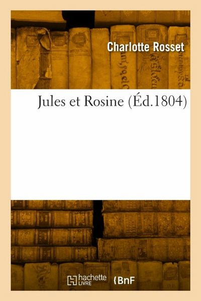 Jules et Rosine, par Mlle Ch. Rosset, ... Date de l'édition originale: 1804 Le présent ouvrage s'inscrit dans une politique de conservation patrimoniale des ouvrages de la littérature Française mise en place avec la BNF. HACHETTE LIVRE et la BNF proposent ainsi un catalogue de titres indisponibles, la BNF ayant numérisé ces oeuvres et HACHETTE LIVRE les imprimant à la demande. Certains de ces ouvrages reflètent des courants de pensée caractéristiques de leur époque, mais qui seraient aujourd'hui jugés condamnables. Ils n'en appartiennent pas moins à l'histoire des idées en France et sont susceptibles de présenter un intérêt scientifique ou historique. Le sens de notre démarche éditoriale consiste ainsi à permettre l'accès à ces oeuvres sans pour autant que nous en cautionnions en aucune façon le contenu. Pour plus d'informations, rendez-vous sur www.hachettebnf.fr