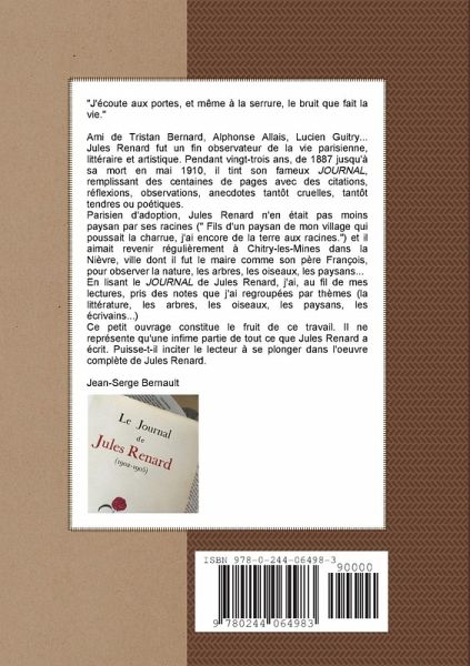 Fin observateur de la société, Jules Renard a tenu son fameux Journal de 1887 jusqu'à sa mort en 1910. Vingt-trois années durant lesquelles il a observé ses contemporains, parisiens et provinciaux. Il a ainsi écrit des centaines de pages avec des citations tantôt cruelles, tantôt tendres ou poétiques qui font toujours mouche. Des centaines de pages dans lesquelles le lecteur peut plonger, n'importe où, n'importe quand, picorant quelques réflexions, observations, de-ci de-là, reposant le livre pour le reprendre le lendemain ou quelques jours plus tard pour à nouveau butiner au hasard. Dans ce livre, le lecteur trouvera des extraits du Journal de Jules Renard. Ces morceau choisis ont été répertoriés par grands thèmes : la littérature, les femmes, les oiseaux, les arbres, les écrivains, la mort, le talent, le bonheur... Puisse cet ouvrage inciter le lecteur à se plonger dans l'uvre complète de Jules Renard.