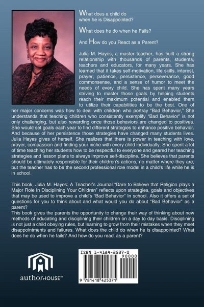 What Does a Child Do When he is Disappointed? What Does He do when He Fails? And How Do Yon React as a Parent? Julia M. Hayes, a master teacher, has built a strong relationship with thousands of parents, students, teachers and educators, for many years. She has learned that it takes self-motivation, life skills, interest, prayer, patience, persistence, perseverance, good commonsense, and a sense of humor to meet the needs of every child. She has spent many years striving to master those goals by helping students reach their maximum potential and enabled them to utilize their capabilities to be the best. One of her major concerns was how to deal with children who portray "Bad Behavior," She understands that teaching children who consistently exemplify "Bad Behavior" is not only challenging, but also rewarding once those behaviors are changed to positives. She would set goals each year to find different strategies to enhance positive behavior. And because of her persistence those strategies have changed many students lives, Julia Hayes gives of herself. She realizes that there is power in teaching with love, prayer, compassion and finding your niche with every child individually. She spent a lot of time teaching her students how to be respectful to everyone and geared her teaching strategies and lesson plans to always improve self-discipline. She believes that parents should be ultimately responsible for their children's actions, no matter where they are, but the teacher has to be the second professional role model in a child's life white he is in school. This book, Julia M. Hayes: A Teacher's Journal "Dare to Believe that Religion plays a Major Role In Disciplining Your Children" reflects upon strategies, goals and objectives that may be used to improve a child's "Bad Behavior" In school. Also it offers a set of questions for you to think about and what would you do about "Bad Behavior" as a parent? This book gives the parents the opportunity to change their way of thinking about new methods of educating and disciplining their children on a day to day basis. Disciplining is not just a child obeying rules, but learning to grow from their mistakes when they meet disappointments and failures. What does the child do when he is disappointed? What does he do when he fails? And how do you react as a parent?