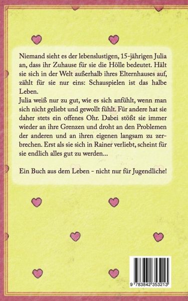 Niemand sieht es der lebenslustigen, 15- jährigen Julia an, dass ihr Zuhause für sie die Hölle bedeutet. Hält sie sich in der Welt außerhalb ihres Elternhauses auf, zählt für sie nur eins: Schauspielen ist das halbe Leben. Julia weiß nur zu gut, wie es sich anfühlt, wenn man sich nicht geliebt und gewollt fühlt. Für andere hat sie daher stets ein offenes Ohr. Dabei stößt sie immer wieder an ihre Grenzen und droht an den Problemen der anderen und an ihren eigenen zu zerbrechen. Erst als sie sich in Rainer verliebt, scheint für sie endlich alles gut zu werden...Ein Buch aus dem Leben - nicht nur für Jugendliche!