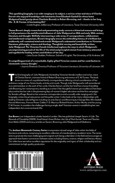 The first biography of Julia Wedgwood, the leading Victorian female intellect and writer, niece of Charles Darwin, intimate friend of Robert Browning and mentor of E. M. Forster. The book draws on a mass of unpublished family correspondence offering critical consideration of her ambitious range of non-fiction books, articles and novels.