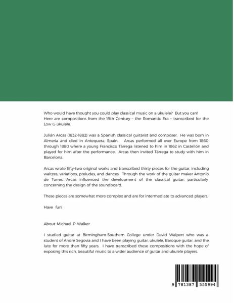 Who would have thought you could play classical music on a ukulele? But you can! Here are compositions from the 19th Century - the Romantic Era - transcribed for the Low G ukulele. Julián Arcas (1832-1882) was a Spanish classical guitarist and composer. He was born in Almería and died in Antequera, Spain. Arcas performed all over Europe from 1860 through 1880 where a young Francisco Tárrega listened to him in 1862 in Castellón and played for him after the performance. Arcas then invited Tárrega to study with him in Barcelona. Arcas wrote fifty-two original works and transcribed thirty pieces for the guitar, including waltzes, variations, preludes, and dances. Through the work of the guitar maker Antonio de Torres, Arcas influenced the development of the classical guitar, particularly concerning the design of the soundboard. These pieces are somewhat more complex and are for intermediate to advanced players. Have fun!