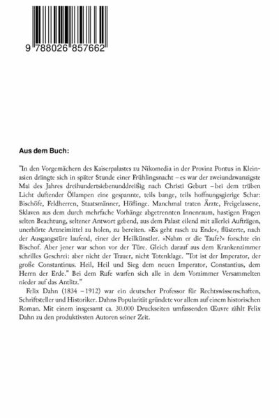 Aus dem Buch: "In den Vorgemächern des Kaiserpalastes zu Nikomedia in der Provinz Pontus in Kleinasien drängte sich in später Stunde einer Frühlingsnacht - es war der zweiundzwanzigste Mai des Jahres dreihundertsiebenunddreißig nach Christi Geburt - bei dem trüben Licht duftender Öllampen eine gespannte, teils bange, teils hoffnungsgierige Schar: Bischöfe, Feldherren, Staatsmänner, Höflinge. Manchmal traten Ärzte, Freigelassene, Sklaven aus dem durch mehrfache Vorhänge abgetrennten Innenraum, hastigen Fragen selten Beachtung, seltener Antwort gebend, aus dem Palast eilend mit allerlei Aufträgen, unerhörte Arzneimittel zu holen, zu bereiten. »Es geht rasch zu Ende«, flüsterte, nach der Ausgangstüre laufend, einer der Heilkünstler. »Nahm er die Taufe?« forschte ein Bischof. Aber jener war schon vor der Türe. Gleich darauf aus dem Krankenzimmer schrilles Geschrei: aber nicht der Trauer, nicht Totenklage. "Tot ist der Imperator, der große Constantinus. Heil, Heil und Sieg dem neuen Imperator, Constantius, dem Herrn der Erde." Bei dem Rufe warfen sich alle in dem Vorzimmer Versammelten nieder auf das Antlitz." Felix Dahn (1834 - 1912) war ein deutscher Professor für Rechtswissenschaften, Schriftsteller und Historiker. Dahns Popularität gründete vor allem auf einem historischen Roman. Mit einem insgesamt ca. 30.000 Druckseiten umfassenden OEuvre zählt Felix Dahn zu den produktivsten Autoren seiner Zeit.