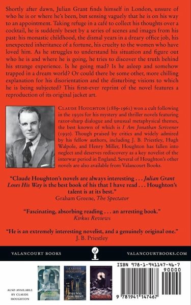 "Claude Houghton's novels are always interesting . . . Julian Grant Loses His Way is the best book of his that I have read . . . Houghton's talent is at its best." - Graham Greene, The Spectator "Fascinating, absorbing reading . . . an arresting book." - Kirkus Reviews "He is an extremely interesting novelist, and a genuinely original one." - J. B. Priestley Shortly after dawn, Julian Grant finds himself in London, unsure of who he is or where he's been, but sensing vaguely that he is on his way to an appointment. Taking refuge in a café to collect his thoughts over a cocktail, he is suddenly beset by a series of scenes and images from his past: his monastic childhood, the dismal years in a dreary office job, his unexpected inheritance of a fortune, his cruelty to the women who have loved him. As he struggles to understand his situation and figure out who he is and where he is going, he tries to discover the truth behind his strange experience. Is he going mad? Is he asleep and somehow trapped in a surreal dreamworld? Or could there be some other, more chilling explanation for his disorientation and the disturbing visions to which he is being subjected? This first-ever reprint of Houghton's classic novel features a reproduction of its original jacket art. Claude Houghton (1889-1961) won a cult following in the 1930s for his mystery and thriller novels featuring razor-sharp dialogue and unusual metaphysical themes, the best known of which is I Am Jonathan Scrivener (1930). Though praised by critics and widely admired by his fellow authors, including J. B. Priestley, Hugh Walpole, and Henry Miller, Houghton has fallen into neglect and deserves rediscovery as a key novelist of the interwar period in Great Britain. Several of Houghton's other novels are also available from Valancourt Books.