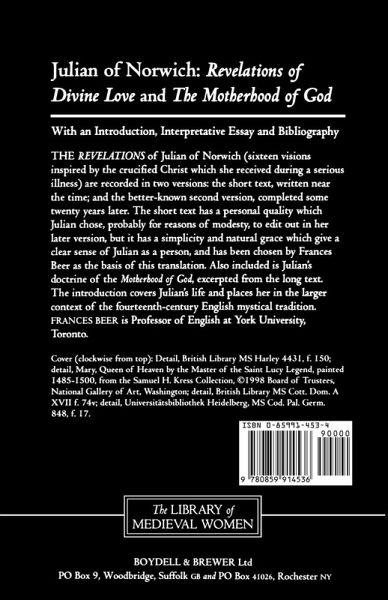 Despite the strange and distant nature of her life and subject-matter, the works of Julian of Norwich remain immediate and compelling. Her Revelationsare recorded in two versions: the short text, or 'first edition', written near the time; and the better-known second version, which is both longer and more complex, completed some twenty years later. The short text, offering personal details edited out in her 'second edition', but which allow a better sense of Julian as a person, is presented here in translation. It includes also those chapters from the long text that describe Julian's doctrine of the Motherhood of God. The volume also contains an introduction, placing Julian in the larger context of the fourteenth-century English mystical tradition, and an Interpretative Essay. FRANCES BEERis Professor of English at York University, Toronto.