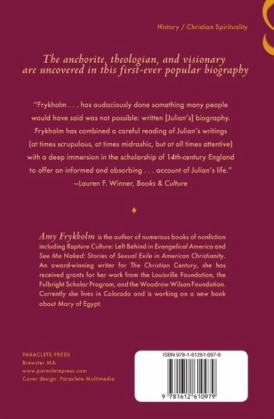 The first fully-realized biography of Julian–theologian, anchorite, and visionary of the Middle Ages. A groundbreaking and sometimes controversial biography that offers full tribute to the mystic Julian of Norwich. In May 1373, a thirty-year-old woman living in East Anglia suffered an illness. She received visions–what she later called "sixteen showings"–revealing to her secrets of the love of God. When she fully recovered, Julian recorded and richly explored those revelations, creating what became the first English-language book written by a woman. Drawing on Julian's own writings, Frykholm's biography paints a vivid picture of the 14th century and this remarkable woman's place in it. Through plague, church corruption, economic devastation, and great personal loss, she presciently addressed her culture's greatest fears and anxieties. Ultimately, Julian's life is shrouded in mystery, and yet she has become a significant figure in contemporary spirituality today. "Frykholm...has audaciously done something many people would have said was not possible: written [Julian's] biography. Frykholm has combined a careful reading of Julian's writings (at times scrupulous, at times midrashic, but at all times attentive) with a deep immersion in the scholarship of 14th-century England to offer an informed and absorbing...account of Julian's life." –Lauren F. Winner, Books & Culture "[Frykhom's] narrative, which she calls 'an act of empathetic imagination, ' crackles with life." –The Denver Post "A sympathetic and realistic portrayal of a saint who, as it turns out, is both holy (that is, set apart) and as complicated as you and me....It reads with the energy of a novel and the insight of a spiritual classic." –Jonathan Wilson-Hartgrove, Christianity Today