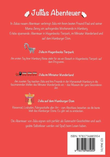 In Julias neuem Abenteuer verbringt Julia mit ihrem besten Freund Paul und seiner Mama Jenny ein aufregendes Wochenende in Hamburg.Erlebe spannende Abenteuer in Hagenbecks Tierpark, im Miniatur Wunderland und auf dem Hamburger Dom.Am ersten Tag ihrer Hamburg Reise steht für sie ein Besuch in Hagenbecks Tierpark auf dem Programm.Am zweiten Tag tauchen Julia und ihre Freunde in der Hansestadt Hamburg in die faszinierenden Welten des Miniatur Wunderlands ein - das Museum der ganz besonderen Art.Riesenrad, Losbuden, Fahrgeschäfte aller Art - zum Abschluss besuchen sie die bunte Welt des Hamburger Doms. Es gibt viel zu entdecken.Die Abenteuer von Julia eignen sich perfekt als Gutenacht-Geschichte und auch geübte Selbstleser werden viel Spaß beim Lesen haben.
