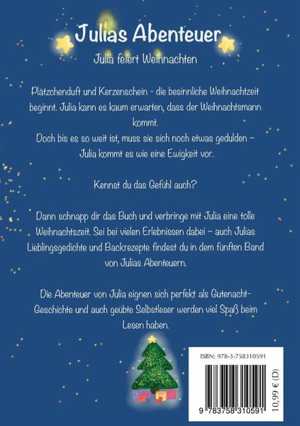 Plätzchenduft und Kerzenschein - die besinnliche Weihnachtszeit beginnt. Julia kann es kaum erwarten, dass der Weihnachtsmann kommt. Doch bis es so weit ist, muss sie sich noch etwas gedulden - Julia kommt es wie eine Ewigkeit vor.Kennst du das Gefühl auch?Dann schnapp dir das Buch und verbringe mit Julia eine tolle Weihnachtszeit. Sei bei vielen Erlebnissen dabei - auch Julias Lieblingsgedichte und Backrezepte findest du in dem fünften Band von Julias Abenteuern.Die Abenteuer von Julia eignen sich perfekt als Gutenacht-Geschichte und auch geübte Selbstleser werden viel Spaß beim Lesen haben.