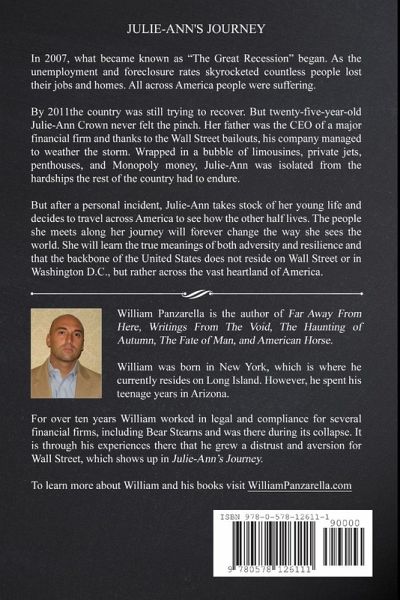 In 2007, what became known as "The Great Recession" began. But twenty-five-year-old Julie-Ann Crown never felt the pinch. Her father was the CEO of a major financial firm and thanks to the Wall Street bailouts, his company managed to weather the storm. Wrapped in a bubble of limousines, private jets, penthouses, and Monopoly money, Julie-Ann was isolated from the hardships the rest of the country had to endure. But after a personal incident, Julie-Ann takes stock of her young life and decides to travel across America to see how the other half lives. The people she meets along her journey will forever change the way she sees the world. She will learn the true meanings of both adversity and resilience and that the backbone of the United States does not reside on Wall Street or in Washington D.C., but rather across the vast heartland of America.