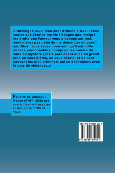 Qu'exigez-vous, mon cher Armand ? Quoi ! vous voulez que j'écrive ma vie ! Songez que, malgré les droits que l'amour vous a donnés sur moi, vous n'avez pas celui de me demander un pareil sacrifice : vous savez, mon ami, qu'il est mille choses pardonnables, lorsqu'on les couvre du voile du mystère ; mais paraissent-elles au grand jour, on vous blâme, on vous décrie, et ce sont souvent les plus criminels qui se déchaînent avec le plus de violence...
