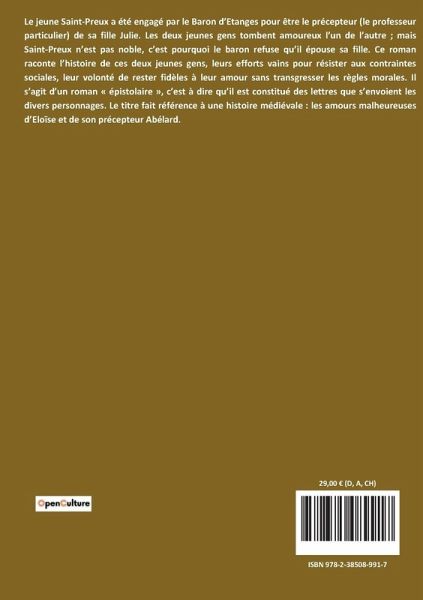 Le jeune Saint-Preux a été engagé par le Baron d¿Etanges pour être le précepteur (le professeur particulier) de sa fille Julie. Les deux jeunes gens tombent amoureux l¿un de l¿autre ; mais Saint-Preux n¿est pas noble, c¿est pourquoi le baron refuse qüil épouse sa fille. Ce roman raconte l¿histoire de ces deux jeunes gens, leurs efforts vains pour résister aux contraintes sociales, leur volonté de rester fidèles à leur amour sans transgresser les règles morales. Il s¿agit d¿un roman « épistolaire », c¿est à dire qüil est constitué des lettres que s¿envoient les divers personnages. Le titre fait référence à une histoire médiévale : les amours malheureuses d¿Eloïse et de son précepteur Abélard.