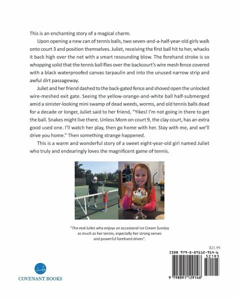 This is an enchanting story of a magical charm. Upon opening a new can of tennis balls, two seven-and-a-half-year-old girls walk onto court 3 and position themselves. Juliet, receiving the first ball hit to her, whacks it back high over the net with a smart resounding blow. The forehand stroke is so whopping solid that the tennis ball flies over the backcourt's wire mesh fence covered with a black waterproofed canvas tarpaulin and into the unused narrow strip and awful dirt passageway. Juliet and her friend dashed to the back-gated fence and shoved open the unlocked wire-meshed exit gate. Seeing the yellow-orange-and-white ball half-submerged amid a sinister-looking mini swamp of dead weeds, worms, and old tennis balls dead for a decade or longer, Juliet said to her friend, "Yikes! I'm not going in there to get the ball. Snakes might live there. Unless Mom on court 9, the clay court, has an extra good used one. I'll watch her play, then go home with her. Stay with me, and we'll drive you home." Then something strange happened. This is a warm and wonderful story of a sweet eight-year-old girl named Juliet who truly and endearingly loves the magnificent game of tennis.