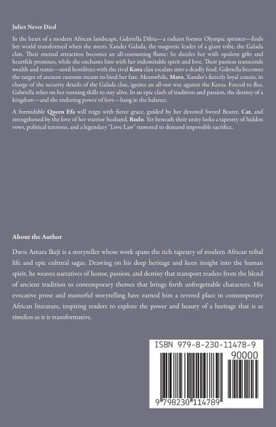 Juliet Never Died In the heart of a modern African landscape, Gabriella Dibia-a radiant former Olympic sprinter-finds her world transformed when she meets Xander Galada, the magnetic leader of a giant tribe, the Galada clan. Their mutual attraction becomes an all-consuming flame: he dazzles her with opulent gifts and heartfelt promises, while she enchants him with her indomitable spirit and love. Their passion transcends wealth and status-until hostilities with the rival Kora clan escalate into a deadly feud. Gabriella becomes the target of ancient customs meant to bind her fate. Meanwhile, Maro, Xander's fiercely loyal cousin, in charge of the security details of the Galada clan, ignites an all-out war against the Koras. Forced to flee, Gabriella relies on her running skills to stay alive. In an epic clash of tradition and passion, the destiny of a kingdom-and the enduring power of love-hang in the balance. A formidable Queen Efa reigns with fierce grace, guided by her devoted Sword Bearer, Cat, and strengthened by the love of her warrior husband, Rudo. Yet beneath their unity lurks a tapestry of hidden vows, political tensions, and a legendary "Love Law" rumored to demand impossible sacrifices.