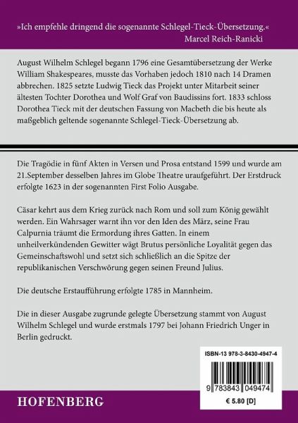 William Shakespeare: Julius Cäsar (The Tragedy of Julius Caesar) Die Tragödie in fünf Akten in Versen und Prosa entstand 1599 und wurde am 21.September desselben Jahres im Globe Theatre uraufgeführt. Der Erstdruck erfolgte 1623 in der sogenannten First Folio Ausgabe. Cäsar kehrt aus dem Krieg zurück nach Rom und soll zum König gewählt werden. Ein Wahrsager warnt ihn vor den Iden des März, seine Frau Calpurnia träumt die Ermordung ihres Gatten. In einem unheilverkündenden Gewitter wägt Brutus persönliche Loyalität gegen das Gemeinschaftswohl und setzt sich schließlich an die Spitze der republikanischen Verschwörung gegen seinen Freund Julius. Die deutsche Erstaufführung erfolgte 1785 in Mannheim. Die in dieser Ausgabe zugrunde gelegte Übersetzung stammt von August Wilhelm Schlegel und wurde erstmals 1797 bei Johann Friedrich Unger in Berlin gedruckt. Zur Schlegel-Tieck-Übersetzung: August Wilhelm Schlegel begann 1796 eine Gesamtübersetzung der Werke William Shakespeares, musste das Vorhaben jedoch 1810 nach 14 Dramen abbrechen. 1825 setzte Ludwig Tieck das Projekt unter Mitarbeit seiner ältesten Tochter Dorothea und Wolf Graf von Baudissins fort. 1833 schloss Dorothea Tieck mit der deutschen Fassung von Macbeth die bis heute als maßgeblich geltende sogenannte Schlegel-Tieck-Übersetzung ab. »Ich empfehle dringend die sogenannte Schlegel-Tieck-Übersetzung.« Marcel Reich-Ranicki Erste deutsche Übersetzungen von Caspar Wilhelm von Borck (1741) und Christoph Martin Wieland (1764). Die vorliegende Übersetzung stammt von August Wilhelm Schlegel. Erstdruck in: Shakspeare's dramatische Werke. Übersetzt von August Wilhelm Schlegel, Bd. 2, Berlin (Johann Friedrich Unger) 1797. Vollständige Neuausgabe. Herausgegeben von Karl-Maria Guth. Berlin 2015. Textgrundlage ist die Ausgabe: William Shakespeare: Sämtliche Werke in vier Bänden. Band 4, Herausgegeben von Anselm Schlösser. Berlin: Aufbau, 1975. Die Paginierung obiger Ausgabe wird in dieser Neuausgabe als Marginalie zeilengenau mitgeführt. Umschlaggestaltung von Thomas Schultz-Overhage unter Verwendung des Bildes: Willi, Tim Tempelhofer, 2015. Gesetzt aus Minion Pro, 11 pt.