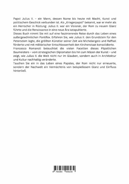 Papst Julius II. - ein Mann, dessen Name bis heute mit Macht, Kunst und politischem Geschick verbunden ist. Als "Kriegerpapst" bekannt, war er mehr als ein Herrscher in Rüstung: Julius II. war ein Visionär, der Rom zu neuem Glanz führte und die Renaissance in eine neue Ära katapultierte.Dieses Buch nimmt Sie mit auf eine faszinierende Reise durch das Leben eines außergewöhnlichen Pontifex. Erfahren Sie, wie Julius II. den Grundstein für den Petersdom legte, die größten Künstler seiner Zeit wie Michelangelo und Raffael förderte und mit militärischer Entschlossenheit den Kirchenstaat konsolidierte.Francesco Romanoli beleuchtet die vielen Facetten dieses Päpstlichen Baumeisters - vom strategischen Diplomaten bis hin zum Mäzen der Kunst - und zeigt, wie Julius II. die Welt nicht nur im Glauben, sondern auch in Architektur und Kultur nachhaltig veränderte.Tauchen Sie ein in das Leben eines Papstes, der Rom nicht nur erneuerte, sondern der Nachwelt ein Vermächtnis von beispiellosem Glanz und Einfluss hinterließ.