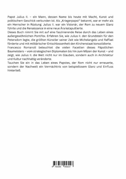 Papst Julius II. - ein Mann, dessen Name bis heute mit Macht, Kunst und politischem Geschick verbunden ist. Als "Kriegerpapst" bekannt, war er mehr als ein Herrscher in Rüstung: Julius II. war ein Visionär, der Rom zu neuem Glanz führte und die Renaissance in eine neue Ära katapultierte.Dieses Buch nimmt Sie mit auf eine faszinierende Reise durch das Leben eines außergewöhnlichen Pontifex. Erfahren Sie, wie Julius II. den Grundstein für den Petersdom legte, die größten Künstler seiner Zeit wie Michelangelo und Raffael förderte und mit militärischer Entschlossenheit den Kirchenstaat konsolidierte.Francesco Romanoli beleuchtet die vielen Facetten dieses Päpstlichen Baumeisters - vom strategischen Diplomaten bis hin zum Mäzen der Kunst - und zeigt, wie Julius II. die Welt nicht nur im Glauben, sondern auch in Architektur und Kultur nachhaltig veränderte.Tauchen Sie ein in das Leben eines Papstes, der Rom nicht nur erneuerte, sondern der Nachwelt ein Vermächtnis von beispiellosem Glanz und Einfluss hinterließ.