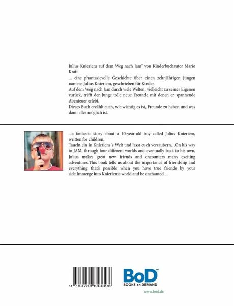 ... eine phantasievolle Geschichte über einen zehnjährigen Jungen namens Julius Knieriem, geschrieben für Kinder und jung gebliebene Erwachsene.Auf dem Weg nach Jam durch viele Welten, vielleicht zu seiner Eigenen zurück, trifft der Junge tolle neue Freunde mit denen er spannende Abenteuer erlebt. Dieses Buch erzählt euch, wie wichtig es ist, Freunde zu haben und was dann alles möglich ist.Taucht ein in Knieriem´s Welt und lasst euch verzaubern..."Ein phantasievoll geschriebenes Buch für Kinder"bücherschlau e.V. 2010...a fantastic story about a 10-year-old boy called Julius Knieriem, written for children and those who remain young at heart.On his way to JAM, through four different worlds and eventually back to his own, Julius makes great new friends and encounters many exciting adventures.This book tells us about the importance of friendship and everything that's possible when you have true friends by your side.Immerge into Knieriem's world and be enchanted ..."A well-written, fantastic book for children"Bücherschlau e.V. 2010